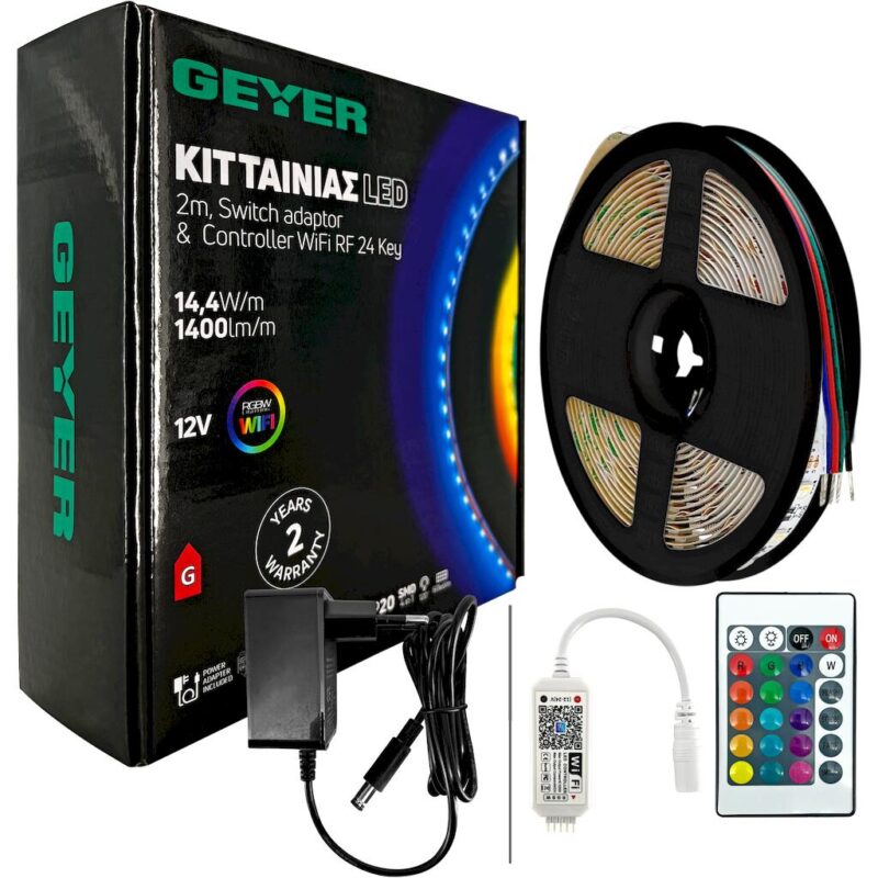 Geyer KIT Ταινίας LED 14,4W 12V RGBW IP20 2m + Αντάπτορας με διακόπτη + Χειριστήριο Wi-Fi RF 24 Key