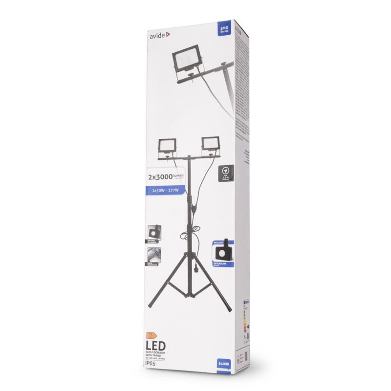 Avide LED Flood Light Slim Αισθητήρας PIR, SMD 2x30W CW 6400K 2 Κεφαλές με Τρίποδο