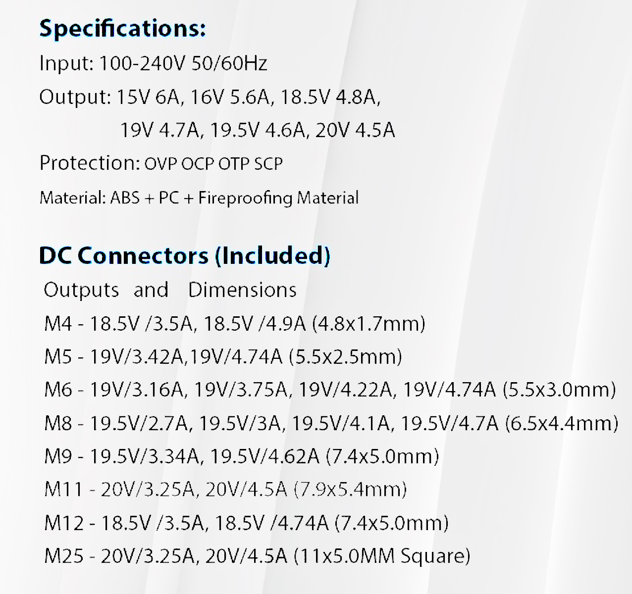 Έξοδος: 15V 6A, 16V 5.6A, 18.5V 4.8A, 19V 4.7A 19.5V 4.6A, 20V 4.5A
