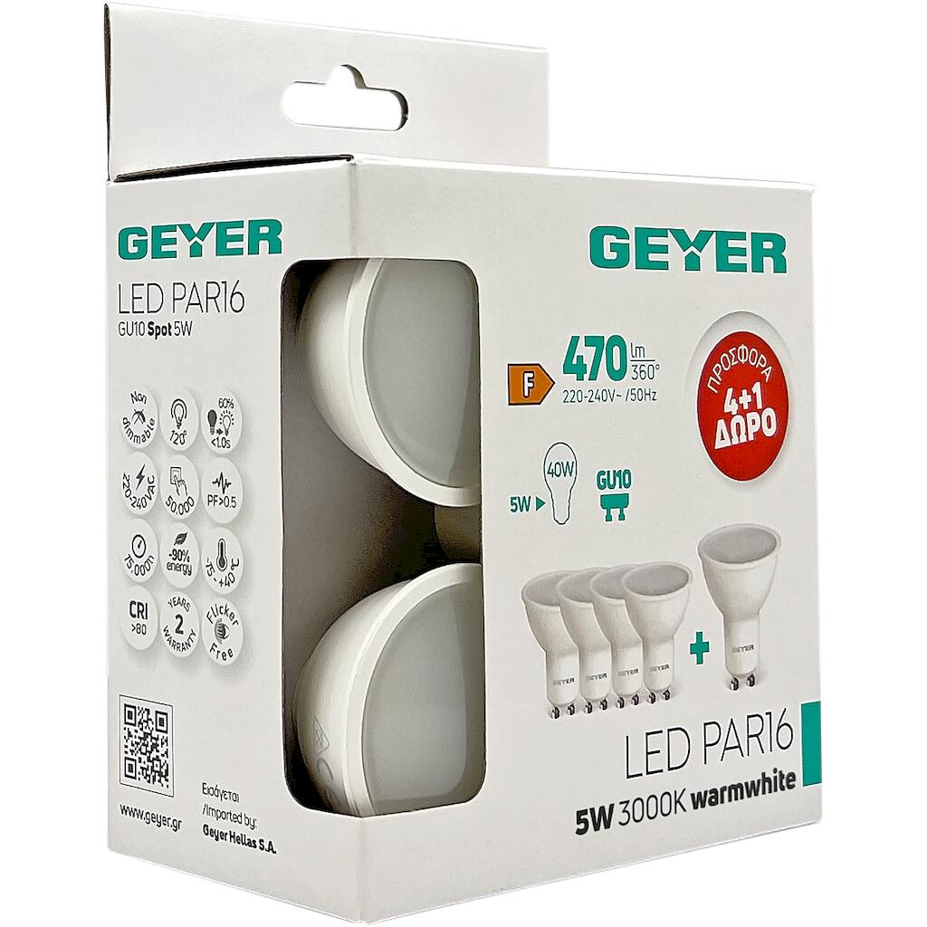 Geyer Λάμπα LED PAR16 5W GU10 3000K 470lm 4+1 ΔΩΡΟ