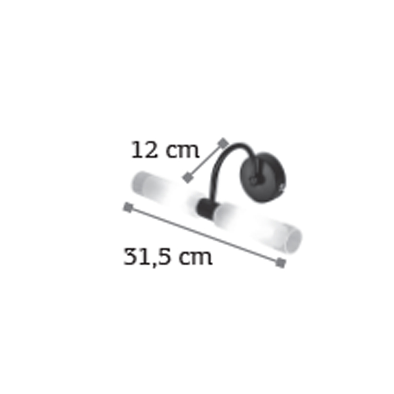 Πρόκειται για ένα επιτοίχιο φωτιστικό κατασκευασμένο από μέταλλο σε μαύρη απόχρωση με δύο λαμπτήρες που καλύπτονται από κυλινδρικό γυαλί αμμοβολής με διάφανες λεπτομέρειες. Είναι η ιδανική επιλογή για φωτισμό μπάνιου τοποθετημένο πάνω από τον καθρέπτη αφού το φως διαχέεται ομοιόμορφα.