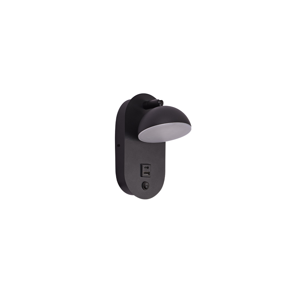Πρόκειται για ένα μεταλλικό μαύρο επιτοίχιο φωτιστικό. Αυτό που ενισχύει την ιδιαιτερότητά του είναι η θύρα usb που είναι ενσωματωμένη και δίνει τη δυνατότητα φόρτισης του κινητού τηλεφώνου!