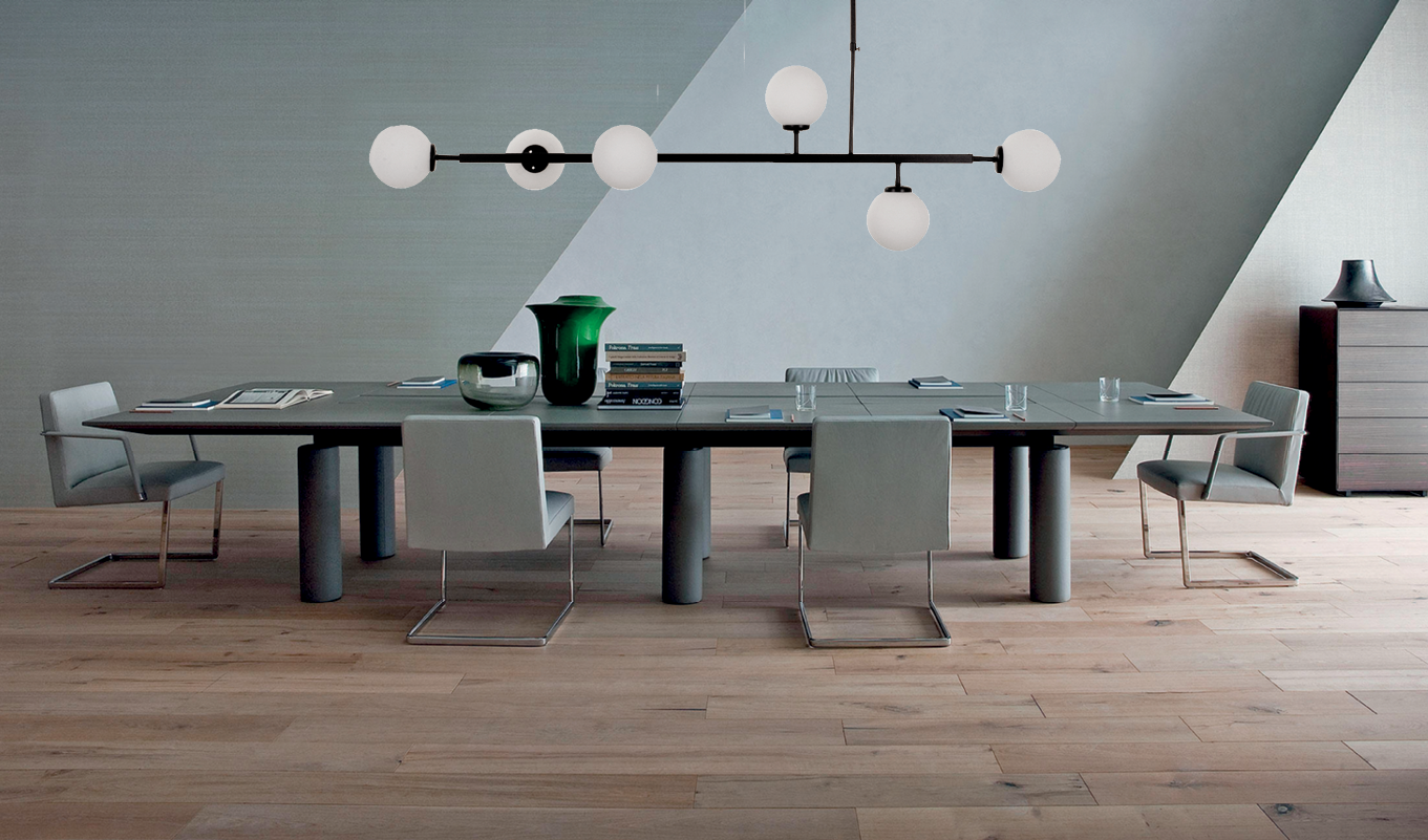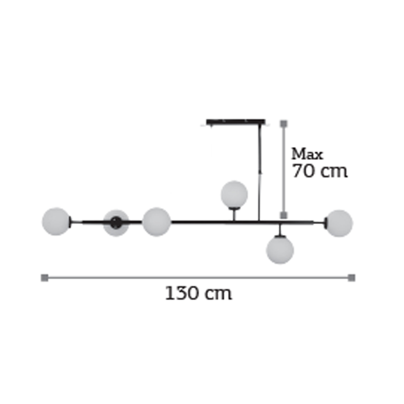 Πρόκειται για ένα μαύρο μεταλλικό κρεμαστό φωτιστικό με λευκή οπαλίνα και έξι λαμπτήρες. Τοποθετείται ιδανικά πάνω από τετράγωνα και ορθογώνια τραπέζια, ώστε να επιτευχθεί ομοιομορφία. Η ανάρτησή του δίνει τη δυνατότητα να προσαρμοστεί στον μοντέρνο χώρο τοποθέτησή του.