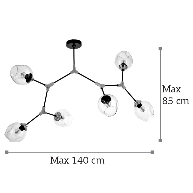 Πρόκειται για ένα μεταλλικό κρεμαστό φωτιστικό μαύρου χρώματος με χρυσαφί διακριτικά στοιχεία και έξι λαμπτήρες. Το γυαλί είναι διάφανο, αλλά υπάρχει και η επιλογή του φιμέ χρώματος. Οι βραχίονες κινούνται για να λάβουν το επιθυμητό σχήμα. Η μίνιμαλ σχεδίασή του το τοποθετεί σε οποιονδήποτε μοντέρνο εσωτερικό χώρο.