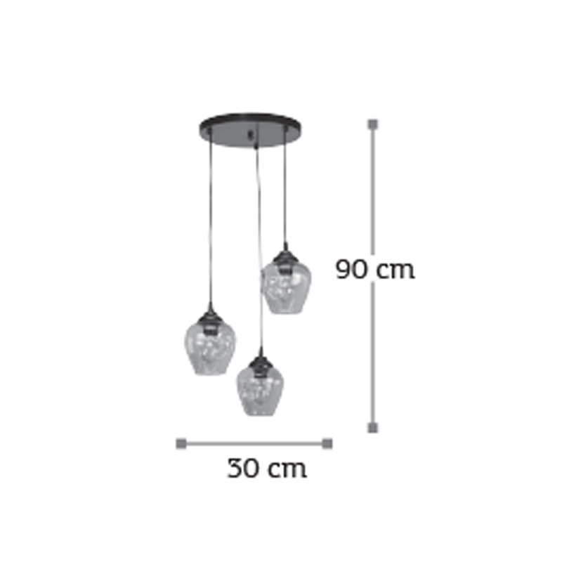Πρόκειται για ένα κρεμαστό φωτιστικό από μαύρο μέταλλο και φιμέ γυαλί με τρεις λαμπτήρες. Διατίθεται και η επιλογή του διάφανου γυαλιού. Το ύψος της ανάρτησης ρυθμίζεται στον κάθε μοντέρνο εσωτερικό χώρο τοποθέτησης του.