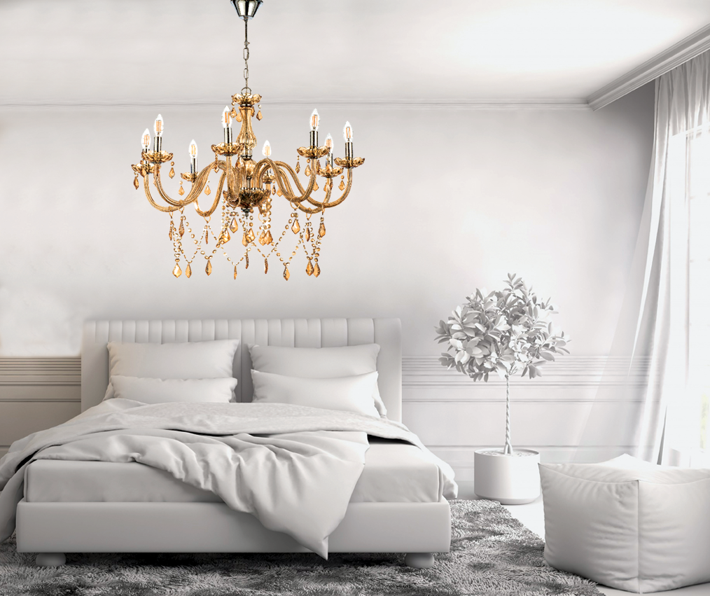 Πρόκειται για ένα μελί γυάλινο κρεμαστό φωτιστικό με οχτώ λαμπτήρες. Τόσο τα μελί κρύσταλλα που κρέμονται όσο και οι χρώμιο μεταλλικές λεπτομέρειες του προσδίδουν μια επιπλέον λάμψη. Η χρώμιο μεταλλική ανάρτηση είναι ρυθμιζόμενη και προσαρμόζεται στον κάθε χώρο.