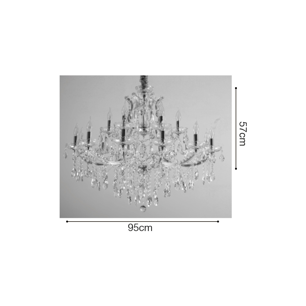 Πρόκειται για ένα κρεμαστό φωτιστικό με δεκα-οχτώ λαμπτήρες. Το σώμα του αποτελείται από χρυσό μέταλλο που καλύπτεται από διάφανο γυαλί. Τα κρύσταλλα που το διακοσμούν είναι διάφανα. Η μεταλλική ανάρτηση είναι ρυθμιζόμενη ώστε να προσαρμόζεται στον κάθε χώρο. Διατίθεται και η επιλογή του υφασμάτινου καπέλου το οποίο πρέπει να ζητηθεί επιπλέον.