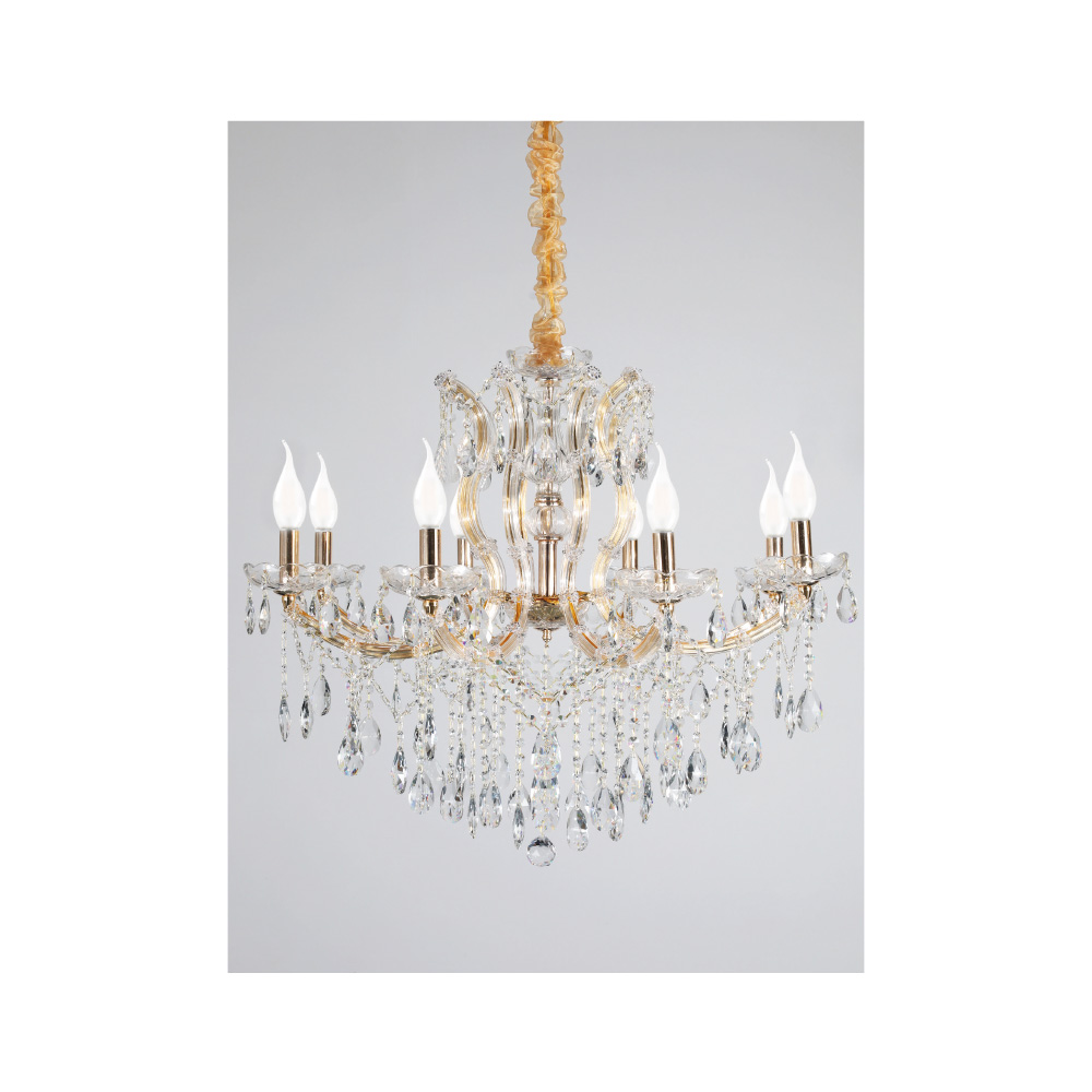 Πρόκειται για ένα κρεμαστό φωτιστικό με οχτώ λαμπτήρες. Το σώμα του αποτελείται από χρυσό μέταλλο που καλύπτεται από διάφανο γυαλί. Τα κρύσταλλα που το διακοσμούν είναι διάφανα. Η μεταλλική ανάρτηση είναι ρυθμιζόμενη ώστε να προσαρμόζεται στον κάθε χώρο. Διατίθεται και η επιλογή του υφασμάτινου καπέλου το οποίο πρέπει να ζητηθεί επιπλέον.