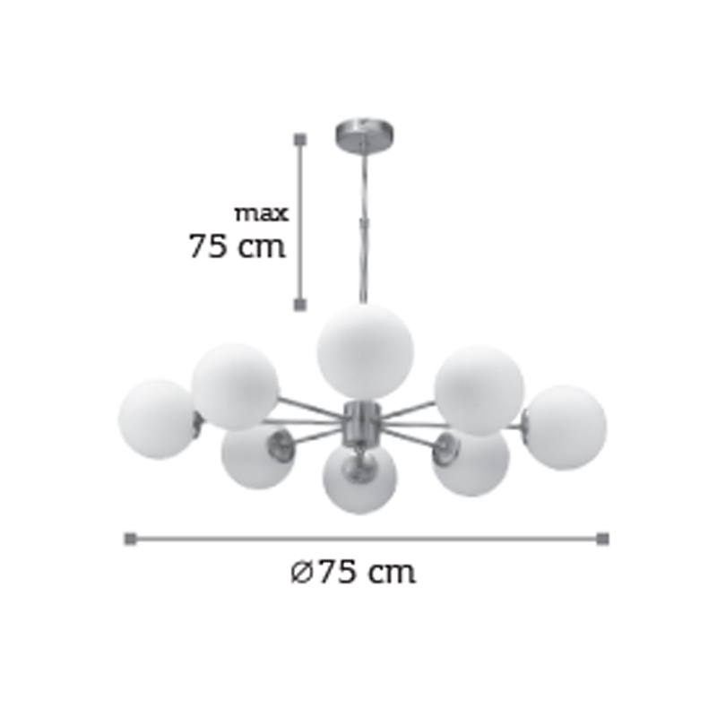 Πρόκειται για ένα χρυσό ματ μεταλλικό φωτιστικό με λευκή οπαλίνα στο τελείωμα και οκτώ λαμπτήρες. Η μίνιμαλ σχεδίασή του το τοποθετεί ιδανικά σε οποιονδήποτε μοντέρνο αλλά και πιο κλασσικό εσωτερικό χώρο. Η ανάρτησή του είναι μεταλλική και ρυθμιζόμενη ώστε να προσαρμοστεί ιδανικά στον χώρο τοποθέτησής του.