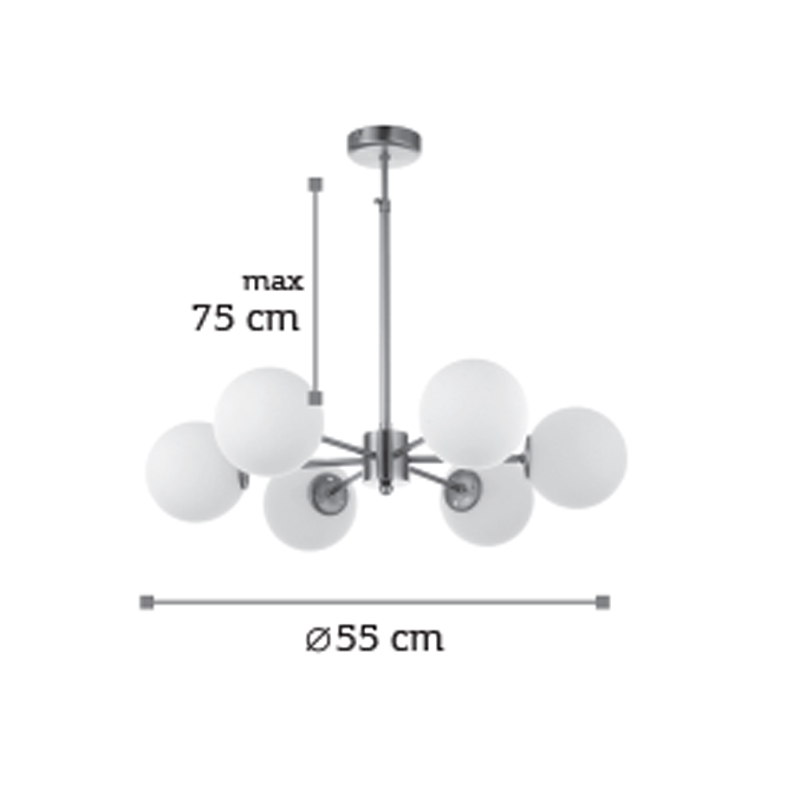 Πρόκειται για ένα χρώμιο μεταλλικό φωτιστικό με λευκή οπαλίνα στο τελείωμα και έξι λαμπτήρες. Η μίνιμαλ σχεδίασή του το τοποθετεί ιδανικά σε οποιονδήποτε μοντέρνο εσωτερικό χώρο. Η ανάρτησή του είναι μεταλλική και ρυθμιζόμενη ώστε να προσαρμοστεί ιδανικά στον χώρο τοποθέτησής του.