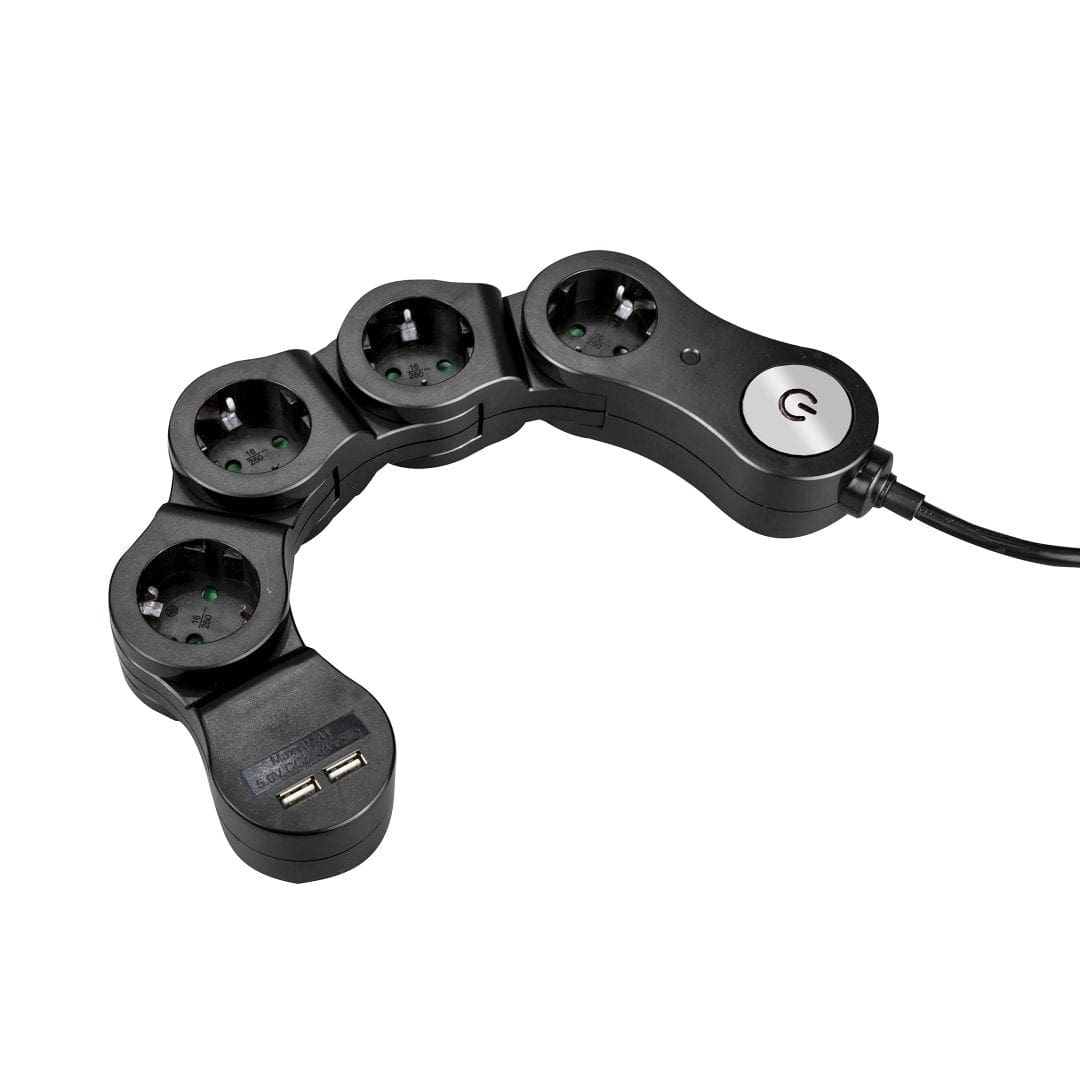 4 WAY SNAKE SOCKET WITH SILVER ROUNT BUTTON SWITCH WITH NICKEL PLATED CONTACTS WITH CHILDREN PROTECTION WITH USB CHARGER MAX 2.1A WITH CABLE 3G1.5mm2*1.5m BLACK 16A/250V/MAX3680W