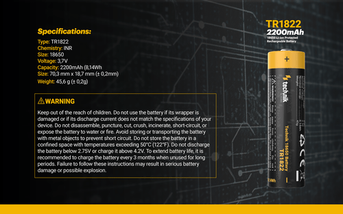 Η Technik TR1822 είναι μια τυπική μπαταρία 18650 Li-ion με χωρητικότητα 2200 mAh. Η μπαταρία τύπου button-top έχει σχεδιαστεί για συσκευές υψηλής κατανάλωσης και μπορεί να χρησιμοποιηθεί σε κάθε φακό, φακό κεφαλής ή ψηφιακή συσκευή που απαιτεί τροφοδοσία 18650. Διαθέτει προστασία από υπερφόρτιση, υπερβολική εκφόρτιση και βραχυκύκλωμα.