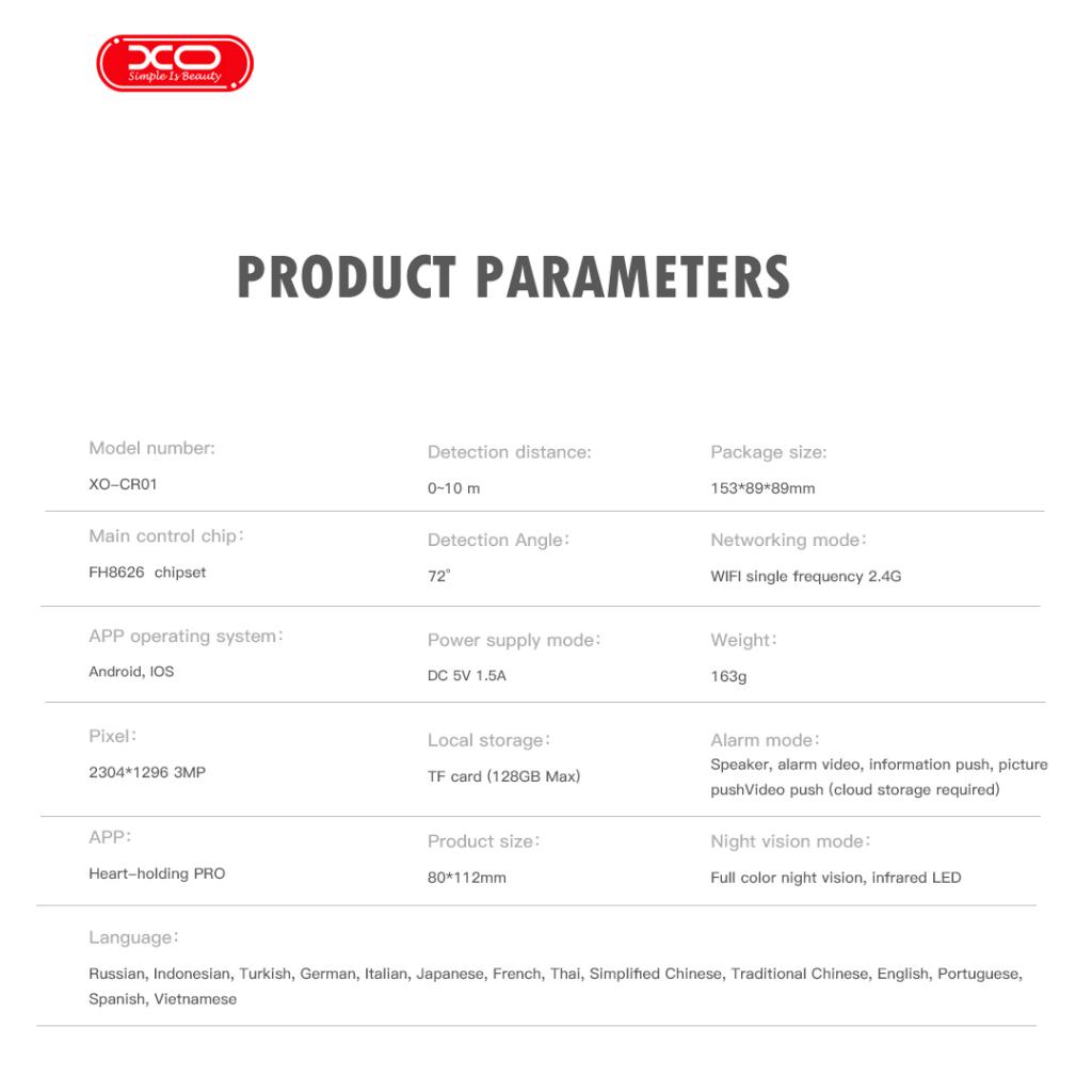 Κύριο τσιπ ελέγχου: FH8626 chipset APP Λειτουργικό σύστημα: Android, IOS pixel: 2304 * 1296 3MP APP: Μέθοδος δικτύωσης CareCamPro: WIFI μονή συχνότητα 2.4G Απόσταση ανίχνευσης: 0-10 μέτρα γωνία ανίχνευσης: 72 °