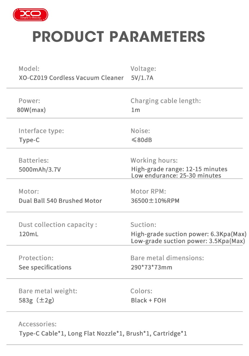 - Μοντέλο: XO-CZ019 Cordless Vacuum Cleaner