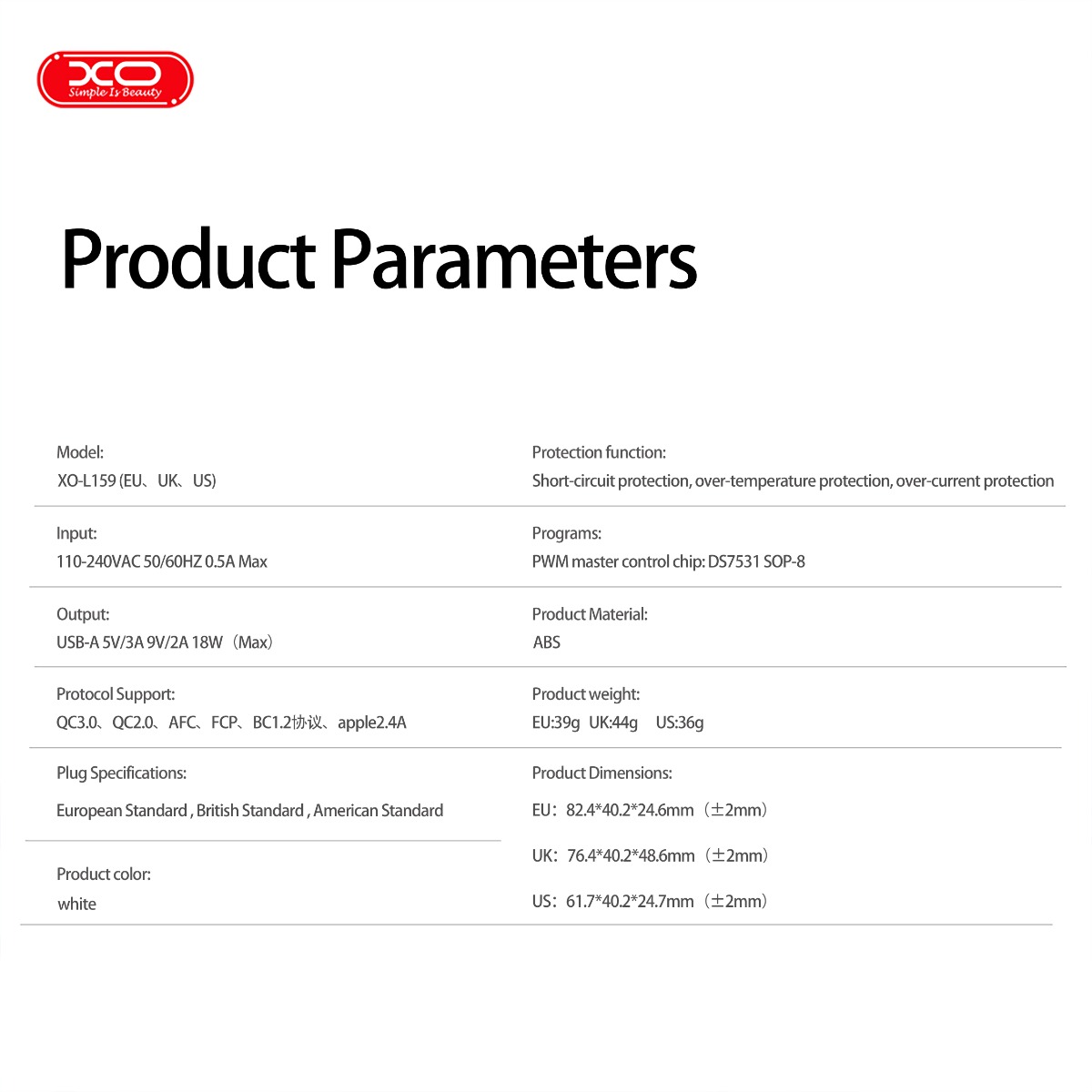 XO L159 Φορτιστής Ταχείας Φόρτισης EU QC18W με USB-A