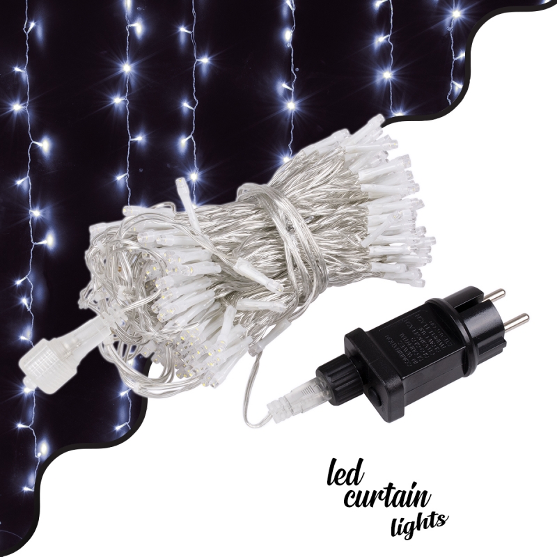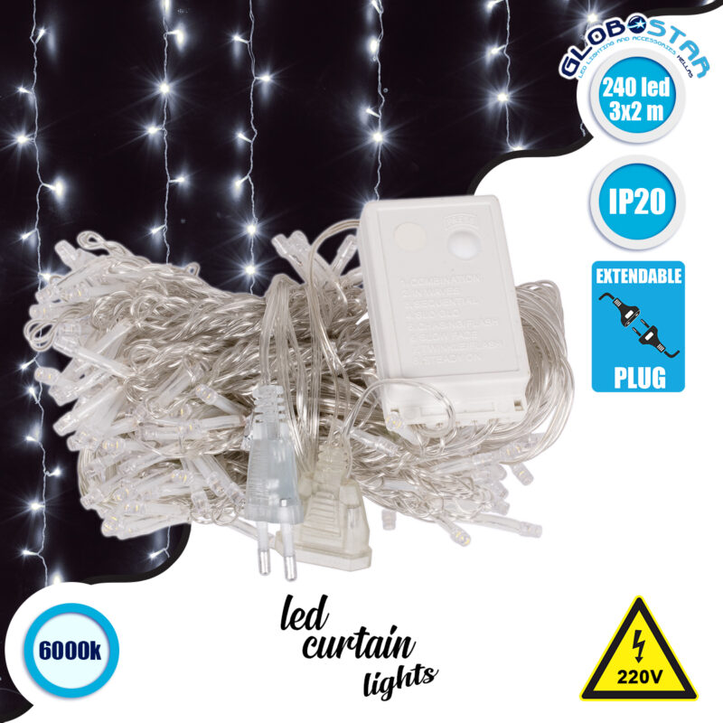 85801 Διακοσμητική Κουρτίνα 3 x 2 Μέτρα με Controller 8 Προγραμμάτων Φωτισμού – Επεκτεινόμενη 240 LED 6W AC 230V με Διάφανο Καλώδιο & Πρίζα Schuko IP20 Ψυχρό Λευκό 6000K Μ3 x Υ2m